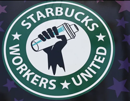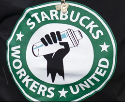 Upon a cursory and detailed review, the similarity in these logos feels different. They share the same shape, same design of concentric circles, and similar star design and colors. Although this union’s logo also features a fist, the fist appears with a shaker commonly seen at a Starbucks. Therefore, this design could instead be viewed as mixing a drink and therefore less associated with the labor movement. Even though this logo does contain the “Workers United” phrase, due to the similarity of the design elements, it is harder to notice the additional wording. Although Starbucks has recently adopted a new logo that does not feature the circle design, this older iconic logo is still used by the company.